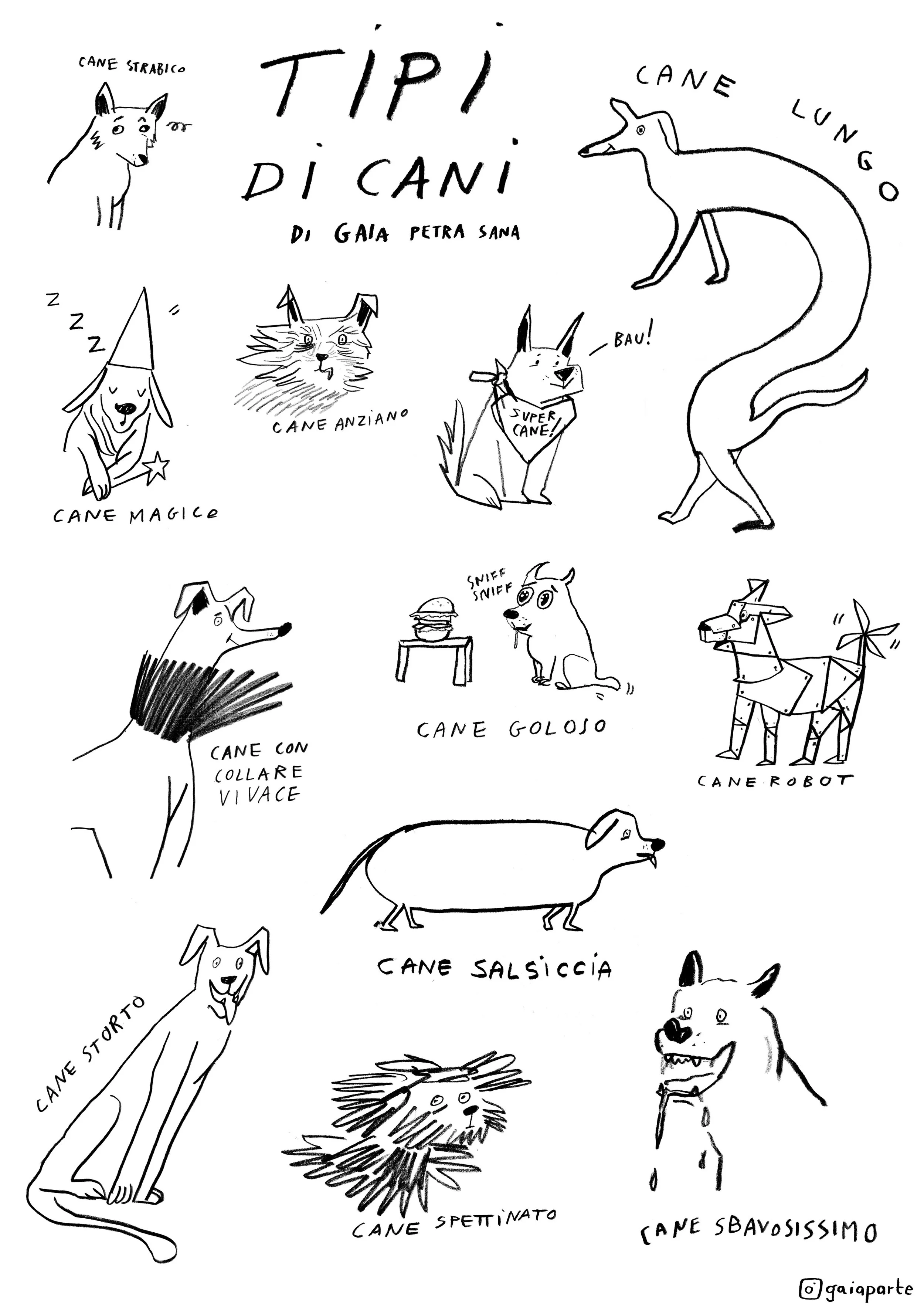 Questo è il mio lavoro sui "Tipi di Cani", una spassosa raccolta di cani speciali schizzati velocemente a matita, che magari assomigliano anche un po' al tuo!